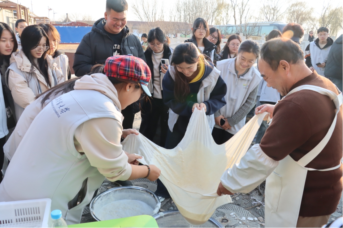 师生调研行第二站抵达天津市蓟州区上仓镇裕泉庄村,北方江南农坊呈现出另一番乡村振兴图景。这里依托“燕子李三故里”文化IP,打造集民俗展示、非遗体验、农耕文化于一体的特色农坊。最让同学们兴奋的是亲身体验石磨豆腐制作。